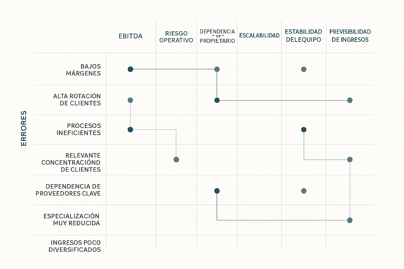 Un mapa visual ayuda a ver de forma inmediata cómo cada error afecta al EBITDA, al riesgo operativo, a la dependencia del propietario, a la escalabilidad, a la estabilidad del equipo y a la previsibilidad de ingresos. Esta visión conjunta permite localizar rápidamente dónde se concentra la pérdida de valor y facilita tomar decisiones con criterio antes de que esos ajustes se reflejen en la valoración final.