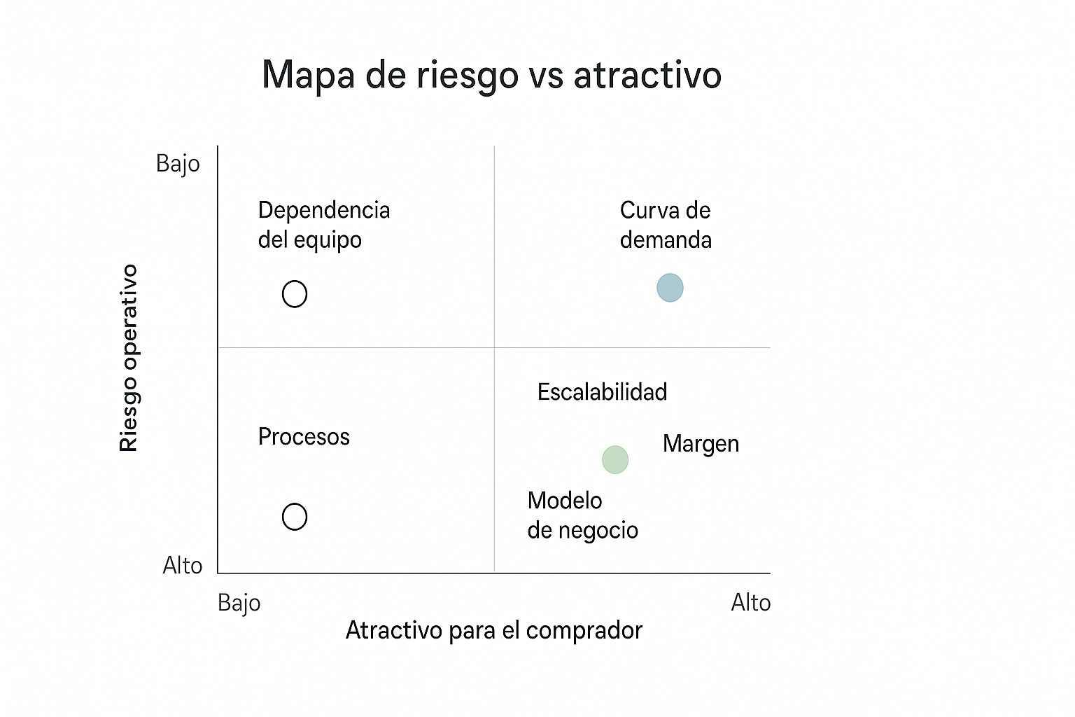 Desde esta perspectiva comparativa, resulta útil visualizar la posición de la clínica en un mapa que cruce riesgo operativo y atractivo para el comprador. En el eje del riesgo se analizan factores como la dependencia del equipo, la estabilidad de la demanda y la solidez de los procesos. En el eje del atractivo se valora la capacidad de escalabilidad, la estructura del margen y la claridad del modelo de negocio. Ubicarse en un cuadrante de riesgo medio o alto permite identificar de forma rápida qué ajustes son prioritarios para reforzar la estabilidad y mejorar un EBITDA real, especialmente en el cierre de año, cuando cada mejora tiene un impacto más visible para el mercado.